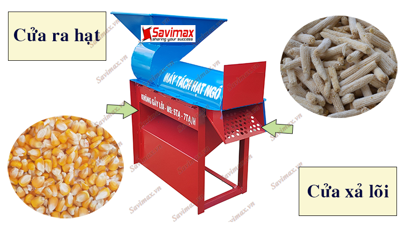 - Hiệu quả năng suất tạo ra từ máy tách hạt ngô tròn hộp quạt 500 - 700kg/h, mỗi mẻ có thể chứa được 10 - 15kg/ mẻ ngô. Phía trước cửa ra thành phẩm ngô đã được tách sạch, cửa xả lõi được thiết kế bên cạnh có thể đóng/mở.